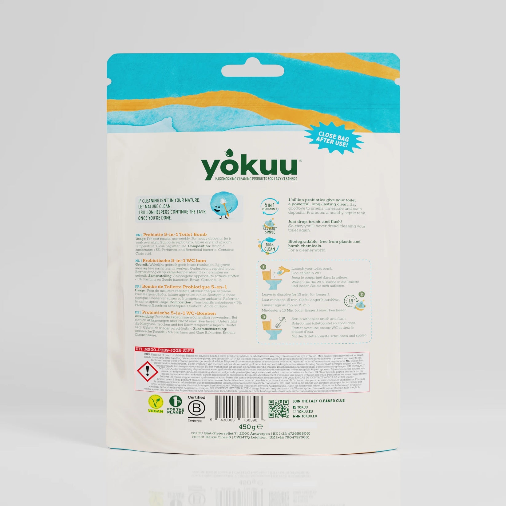 Unsere Toilettenbomben werden in einem recycelbaren Papierbeutel geliefert. Verschließen Sie den Beutel einfach wieder und lagern Sie ihn an einem trockenen Ort.